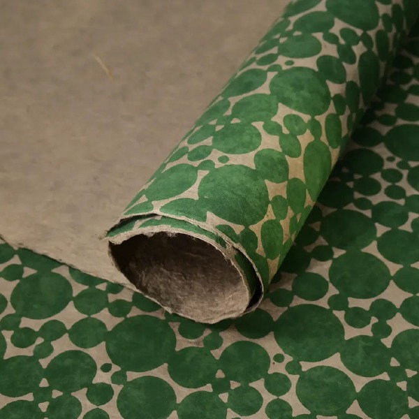 Made from the bark of a special mulberry bush, the branches are harvested and the bark is peeled off. Within 5 -7 years the bush will regrow it's branches. The bark is then beaten and cooked until it becomes smooth. After the cooking process the bark is again beaten and then chopped up by machine into small pieces called pulp. This pulp will then be "dissolved" in a large water tank into which the screen for the sheet is placed, by moving the screen in the water tank the pulp is spread evenly throughout the screen. The screen is slowly removed from the water and the sheet is formed. The paper is dried by having the screen exposed to sun light, either vertically in the mould or traditionally at an angle. The paper is made in remote villages where the lokta grows and then the plain paper sheets are transported to Kathmandu where they are dyed and screen printed.
